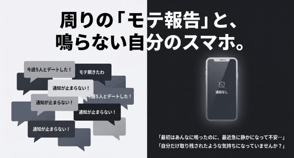 今回は、私がリサーチした市場データやユーザーの実態を交えながら、男性の平均マッチ数まわりで多くの人が気にする「いいかも受信数(女性からアプローチされる数)」のシビアな現実と、それをひっくり返すための具体的な対策について徹底解説します。